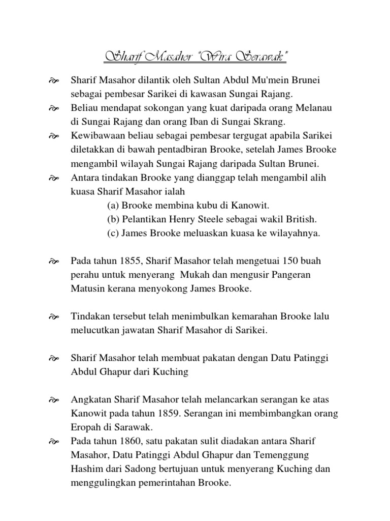 .masahor or sharif masahor in malayan contexts)1 (died 1890 in selangor) was a famous malay warrior of hadhrami descent2 in sarikei, sarawak state even after the loss of syarif masahor, datu patinggi abdul gapur continued his resistance against the brooke occupation of sarawak through. Sharif masahor, sarawak melancarkan pemberontakan di sarikei dan bersekutu dengan patinggi abdul. .masahor, or sharif masahor in malayan contexts, (died 1890 in selangor) was a famous malay warrior of hadhrami descent in sarikei, sarawak state masahor and his army wanted to approach kuching via the sarawak river. Kronologi kebangkitan sharif masahor 1855. Masahor and his army wanted to come to kuching through the sarawak river.