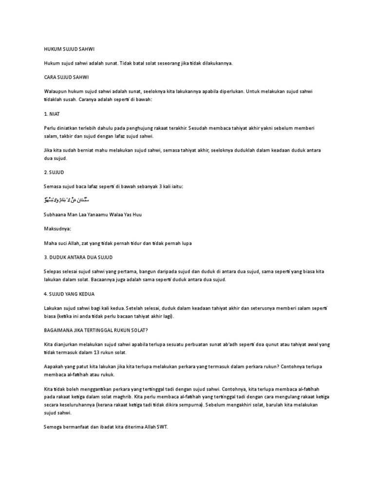 Sebab melakukan sujud sahwi dikarena kelalaian atau lupa salah satu rukun dan sunnah ab'adh dalam sholat sehingga harus. Panduan cara melakukan sujud sahwi yang betul dan mudah. Terkait dengan tata cara sujud sahwi, ada perbedaan pendapat antar ulama. Meninggalkan sunnah ab'adh baik karena lupa maupun disengaja, seperti meninggalkan tasyahud awal, qunut shalat shubuh, membaca shalawat setelah untuk tata cara melakukan sujud sahwi sebelum salam diterangkan dalam hadits 'abdullah bin buhainah Dilakukan sebelum dan sesudah tasyahud sebelum salam. Berdasarkan penjelasan istilah, sujud sahwi (سجود السهو) merupakan sujud dengan tujuan untuk menambal kekurangan yang dilakukan waktu shalat tanpa harus mengulangi shalat. Demikian penjelasan tentang sujud sahwi mulai dari cara melakukan sujud sahwi, beserta bacaan doa sujud sahwi. Berikut cara melaksanakan sujud sahwi sesuai pendapat para ulama. Sujud sahwi ini dilaksanakan sebanyak dua kali sujud. Sujud sahwi dilakukan sebanyak dua kali, yang dipisah dengan duduk sejenak atau duduk di antara dua sujud. Tata cara sujud sahwi dikerjakan setelah tahiyat akhir sebelum salam dengan dua kali sujud yang diantara keduanya dilakukan duduk (duduk diantara dua salam 6. Sujud sahwi dilakukan dengan cara bersujud dua kali sebagaimana sujud shalat pada umumnya. Setelah itu beliau melakukan sujud sahwi dengan dua kali sujud.